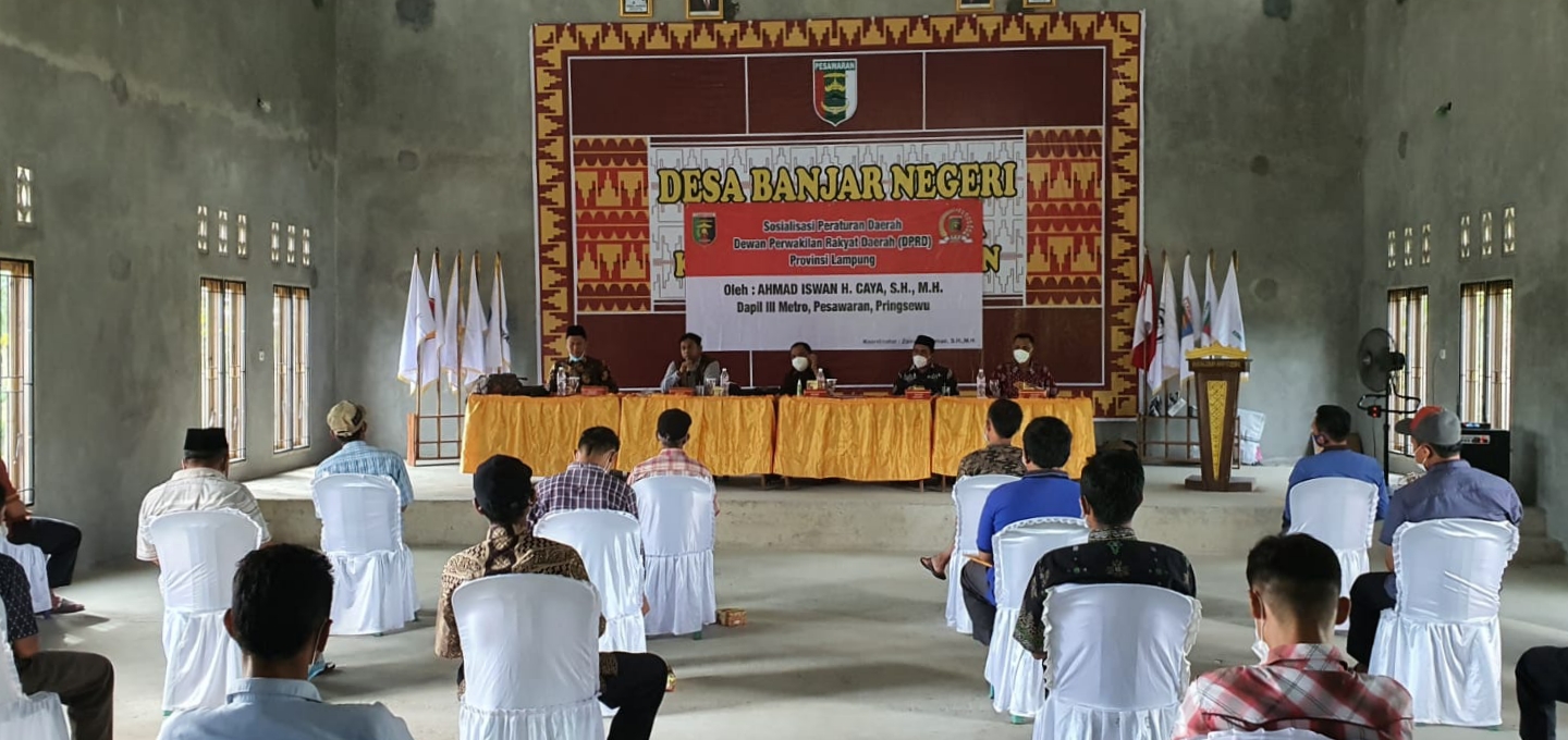 Lampung (DPRD) : Anggota DPRD Provinsi Lampung Iswan H Caya kembali melakukan sosialisasi peraturan daerah (Sosperda) nomor 3 tahun 2020 tentang Adaptasi Kebiasaan Baru (AKB) di Desa Banjar Negeri, Kabupaten Pesawaran, Sabtu (10/07/2021).