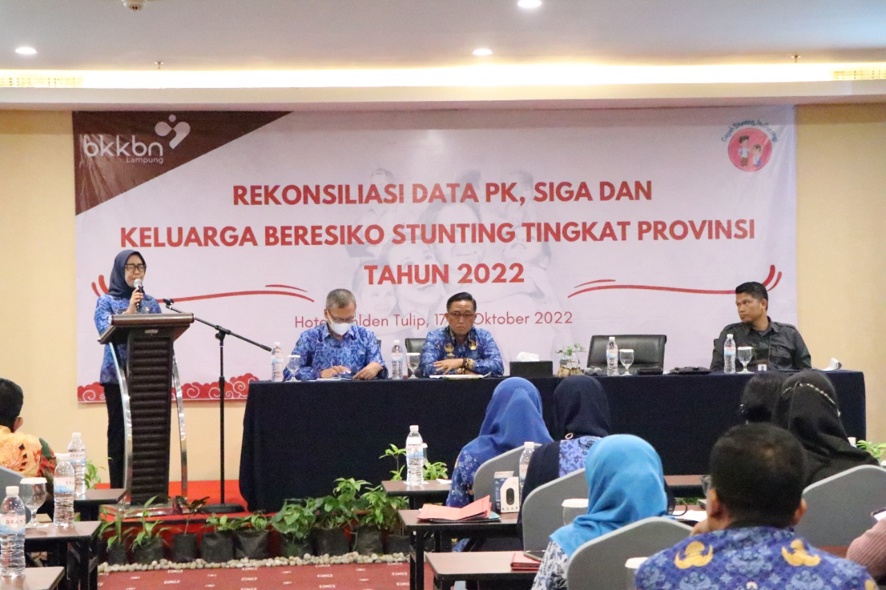 Bandar Lampung — Kepala Dinas Kominfotik Provinsi Lampung Ganjar Jationo dan Fungsional Statistisi Ahli Madya pada BPS Provinsi Lampung Mas’ud Rifai menjadi narasumber dalam Rekonsiliasi Data PK, SIGA, dan Keluarga Beresiko Stunting Tingkat Provinsi Tahun 2022 yang digelar oleh BKKBN Provinsi Lampung bertempat di Hotel Golden Tulip, Senin (17/10/2022).