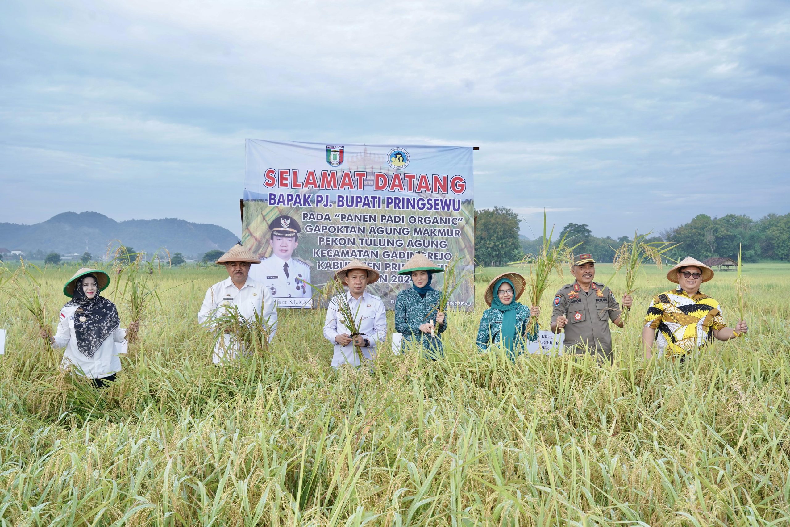 PRINGSEWU : Pj. Bupati Pringsewu Marindo Kurniawan melakukan panen perdana padi organik Gapoktan Agung Makmur di Pekon Tulungagung, Kecamatan Gadingrejo, Kamis (28/3/2024).