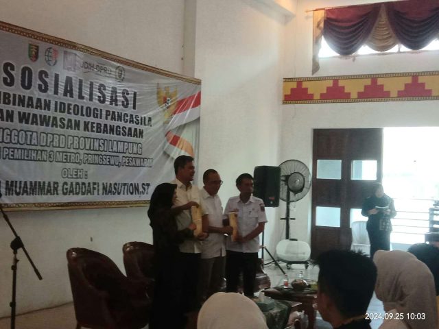 Anggota DPRD Provinsi Lampung Tondi Muammar Gaddafi Nasution yang merupakan anggota DPRD Provinsi Lampung Fraksi Golkar di giat sosialisasi itu mengatakan, hari ini adalah kegiatan sosialisasi pembinaan ideologi pancasila dan wawasan kebangsaan kepada masyarakat Kota Metro. Rabu (25/9/2024)