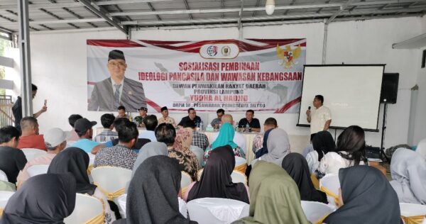 Pesawaran – Giat perdana anggota DPRD Provinsi Lampung periode 2024-2029, mensosialisasikan Pembinaan Ideologi Pancasila dan Wawan Kebangsaan secara serentak di masing-masing Dapil. Hal tersebut bertujuan untuk, memberikan penguatan, pemahaman secara utuh tentang dasar negara Indonesia yaitu Pancasila.