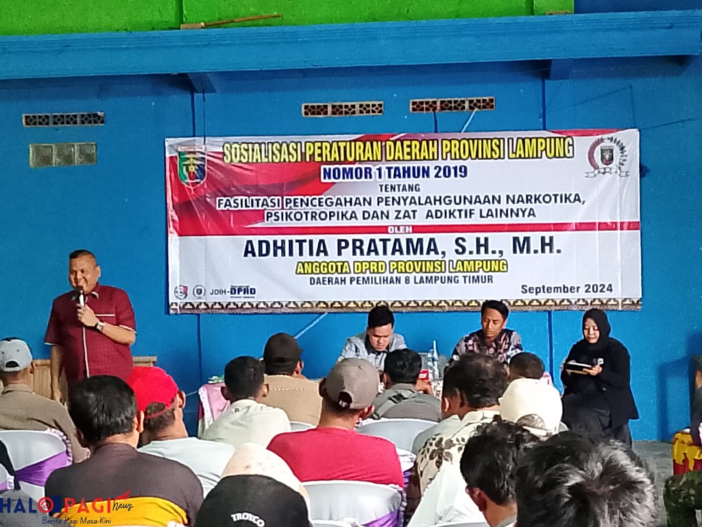 Lampung Timur – Adhitya Pratama SH MH Anggota Dewan Perwakilan Rakyat Daerah (DPRD) Provinsi Lampung Fraksi Golkar melakukan sosialisasi peraturan daerah (sosper) provinsi lampung nomor 1 tahun 2019 tentang fasilitasi pencegahan penyalahgunaan narkotika psikotropika dan zat adiktif lainnya, acara tersebut digelar di Gor Karya Muda, Desa Braja Sakti, Kecamatan Way Jepara, Sabtu (28/09/24).