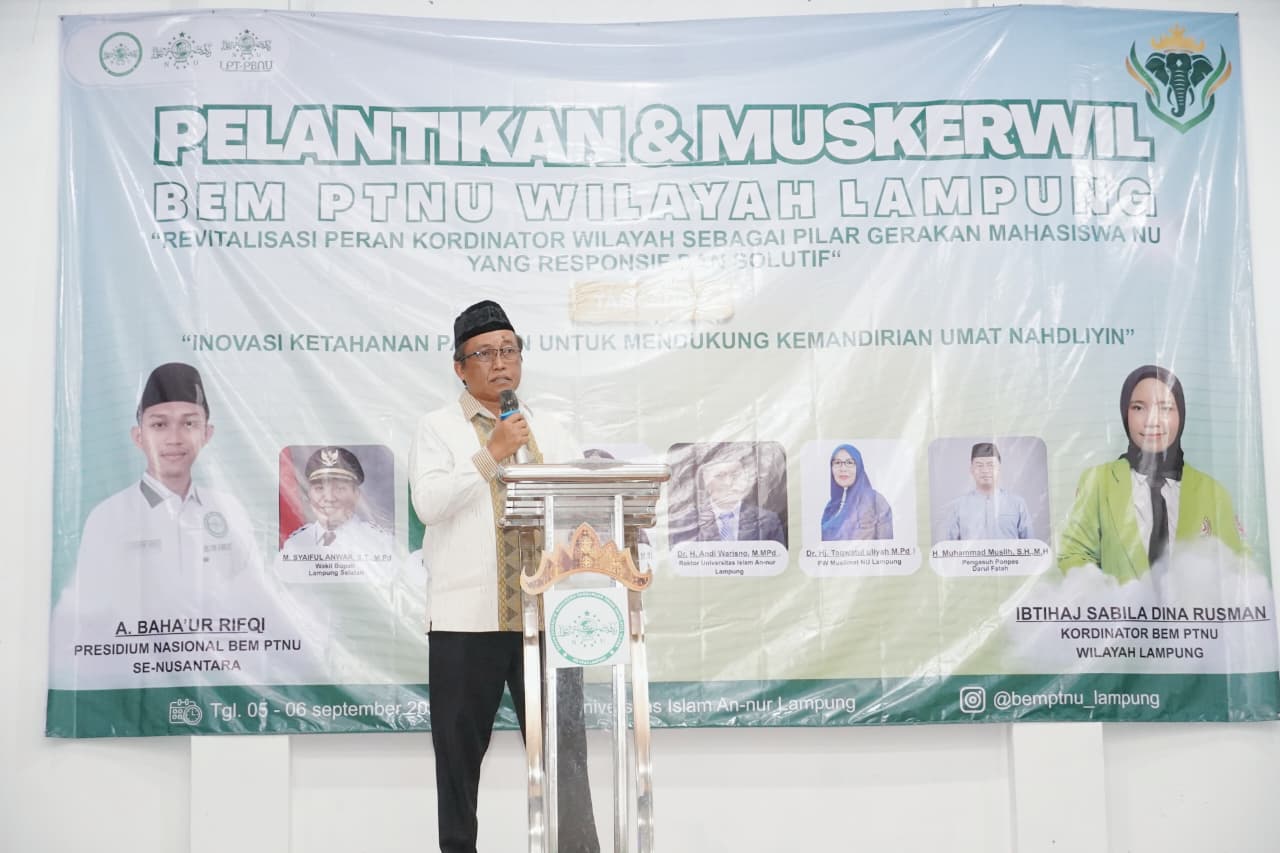 Lampung Selatan, – Gubernur Lampung yang diwakili oleh Kepala Dinas Komunikasi, Informatika, dan Statistik Provinsi Lampung, Ganjar Jationo, menghadiri Pelantikan dan Musyawarah Kerja Wilayah Badan Eksekutif Mahasiswa (BEM) Perguruan Tinggi Nahdlatul Ulama (PTNU) Wilayah Lampung. Acara ini berlangsung di Gedung Serba Guna Universitas An Nur, Lampung Selatan, Jumat (05/09/2025).