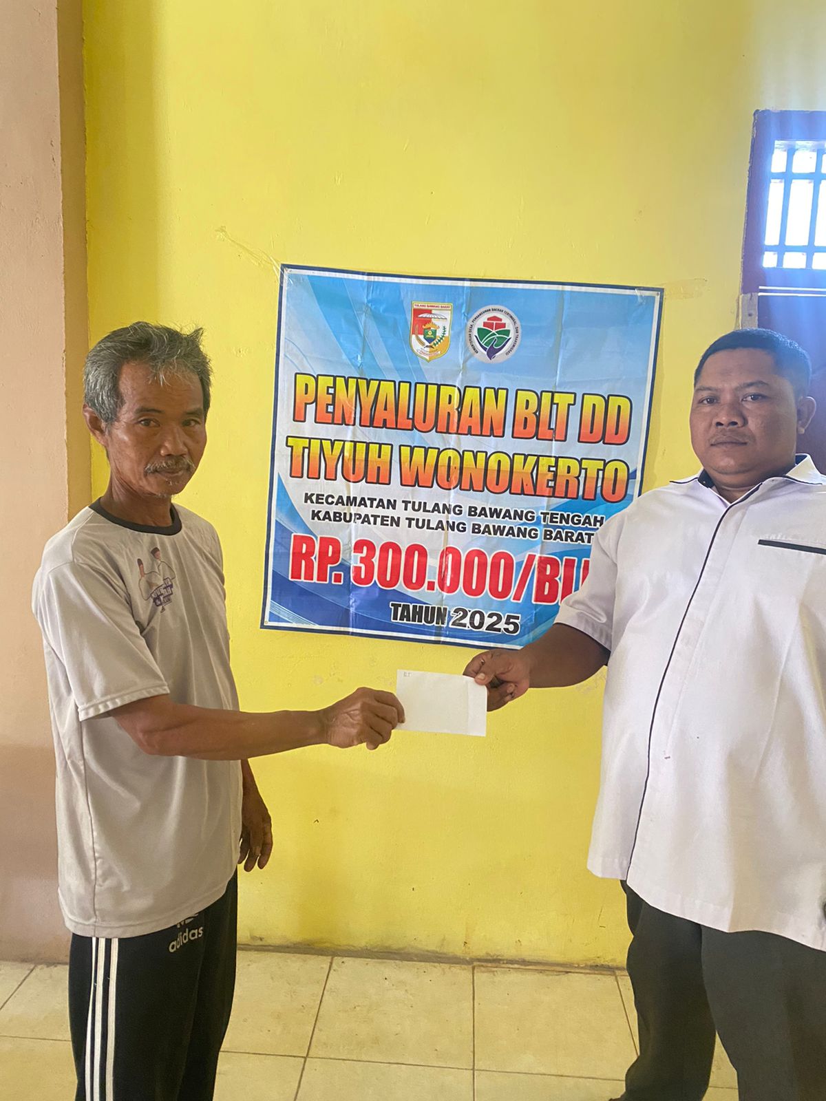 Tulang Bawang Barat-Pemerintah Tiyuh Wonokerto, Kecamatan Tulangbawang Tengah, Kabupaten Tulangbawang Barat menyalurkan Bantuan Langsung Tunai (BLT) kepada 11 Keluarga Penerima Manfaat (KPM).